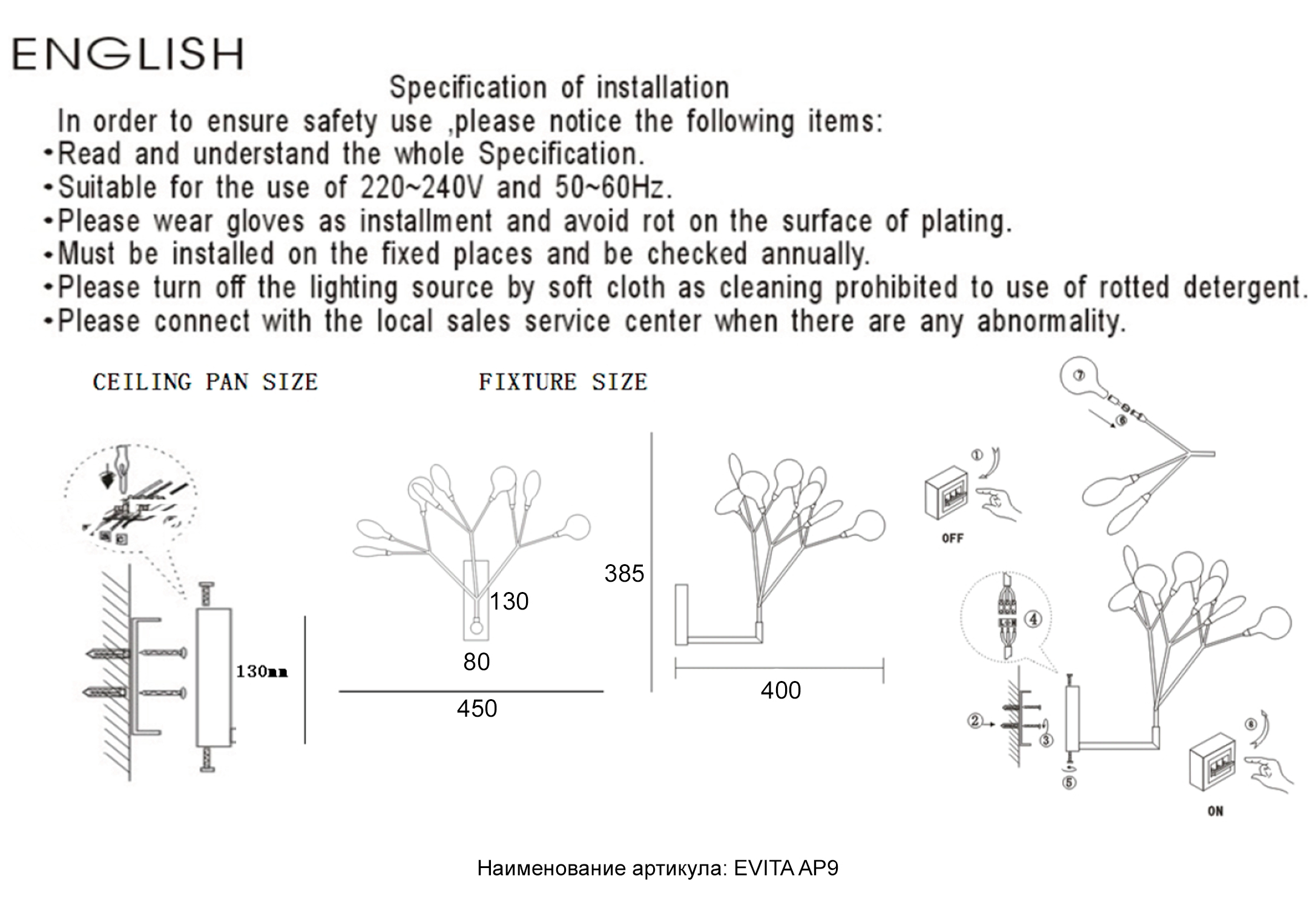 | Размер светильника от стены (мм) | 350 |
